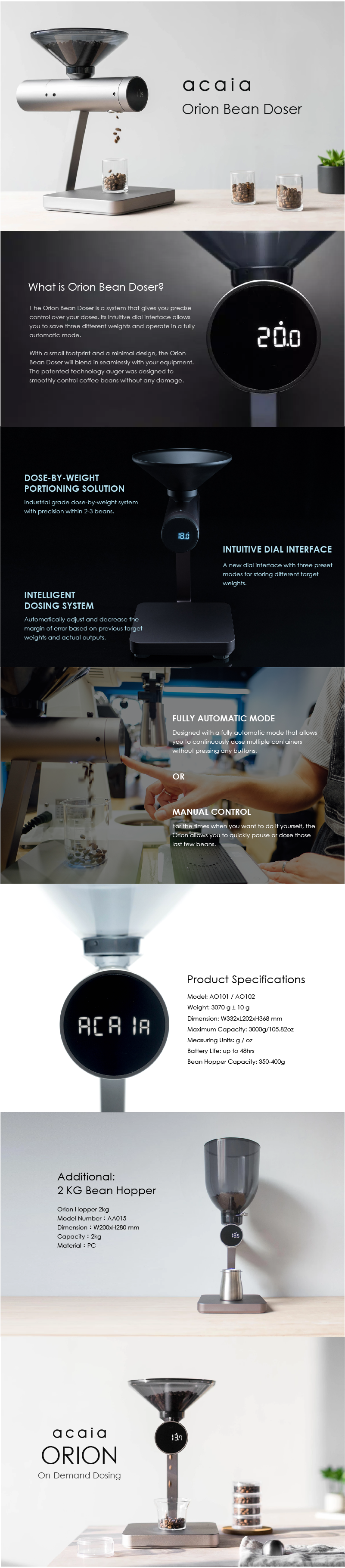 Orion Bean Doser is a system that gives you precise control over your doses. Its intuitive dial interface allows you to save three different weights and operate in a fully automatic mode.