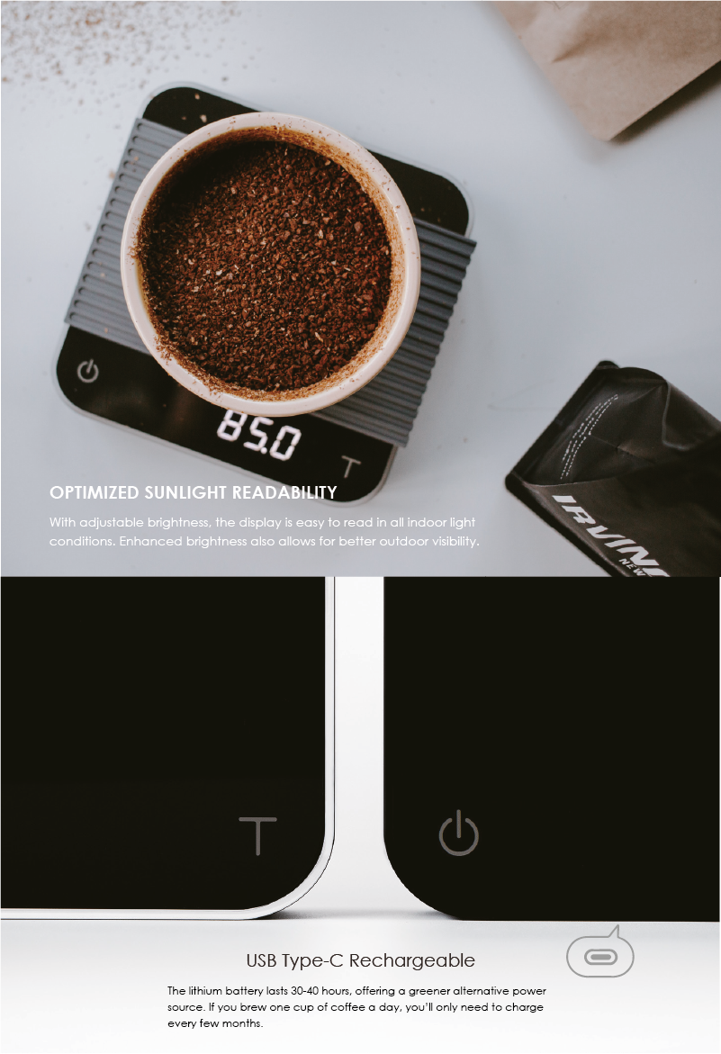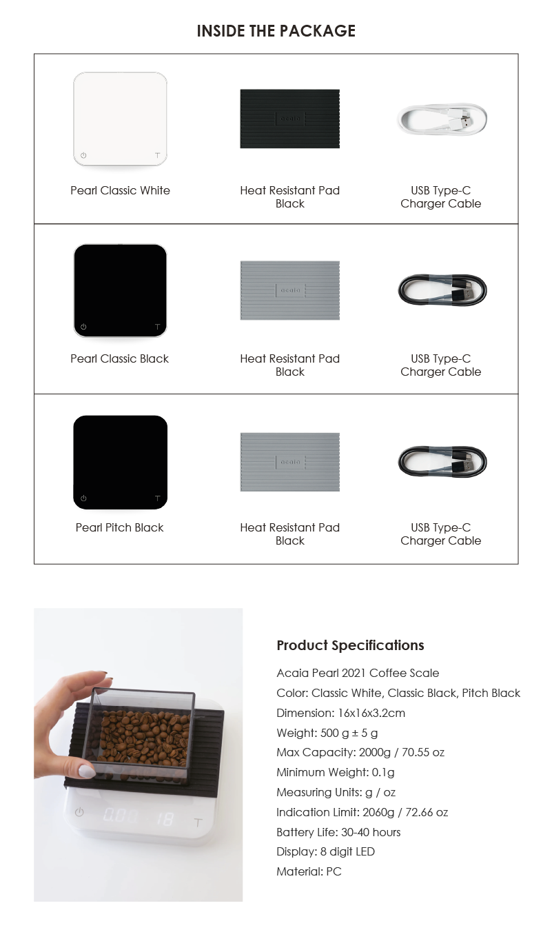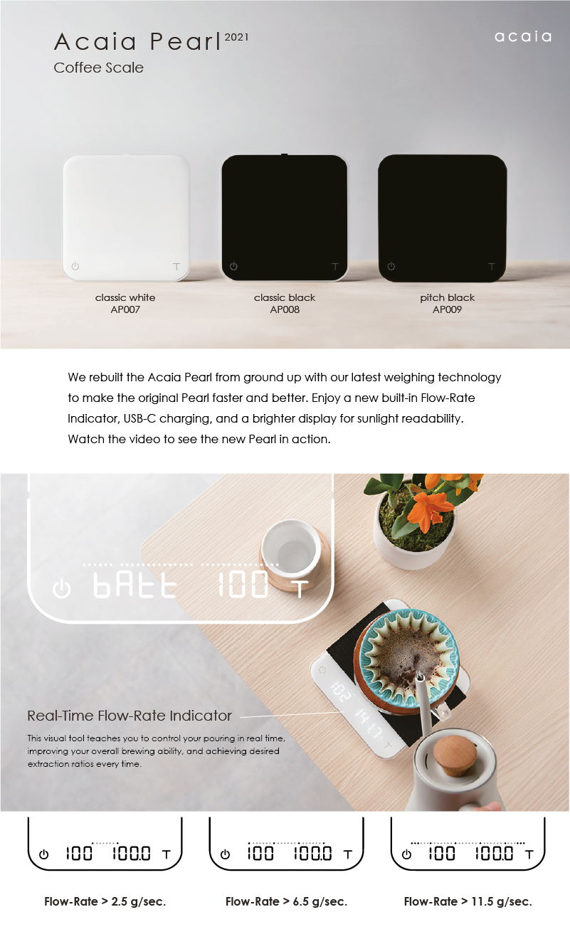 Rebuilt the Acaia Pearl from ground up with our latest weighing technology to make the original Pearl faster and better. Enjoy a new built-in Flow-Rate Indicator, USB-C charging, and a brighter display for sunlight readability.