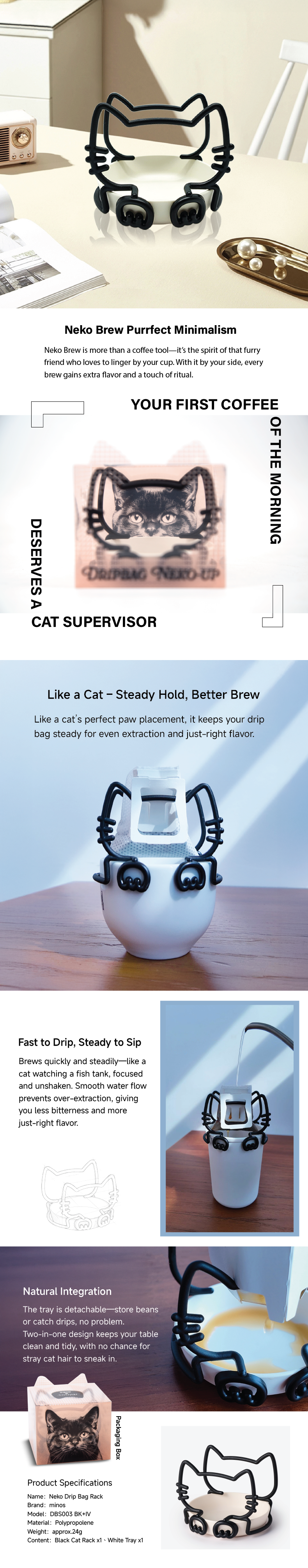 Neko Brew holds drip bags steady for smooth flow and balanced flavor. Detachable tray keeps your table clean. Light, fun, cat-inspired.