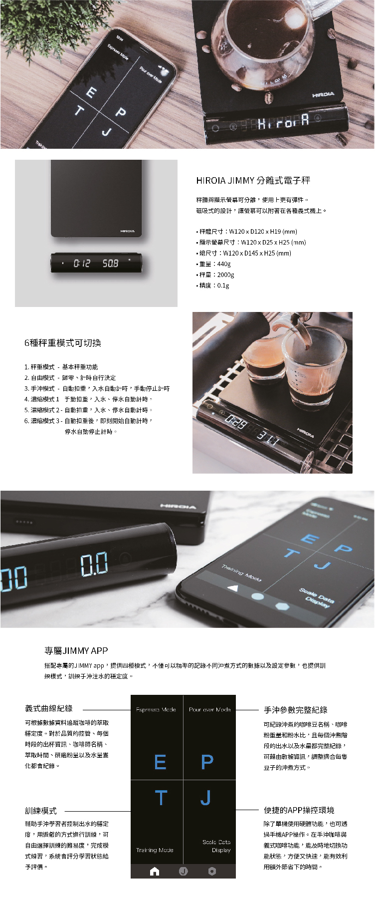 Jimmy 是一款獨特的咖啡電子秤,創新的磁吸分離式螢幕可輕鬆固定在任何位置,讓您的操作視野更有彈性,全方位滿足義式濃縮咖啡與手沖咖啡沖煮需求。 Jimmy app可建立沖煮配方、練習沖煮穩定度並提供豐富的控制選項。