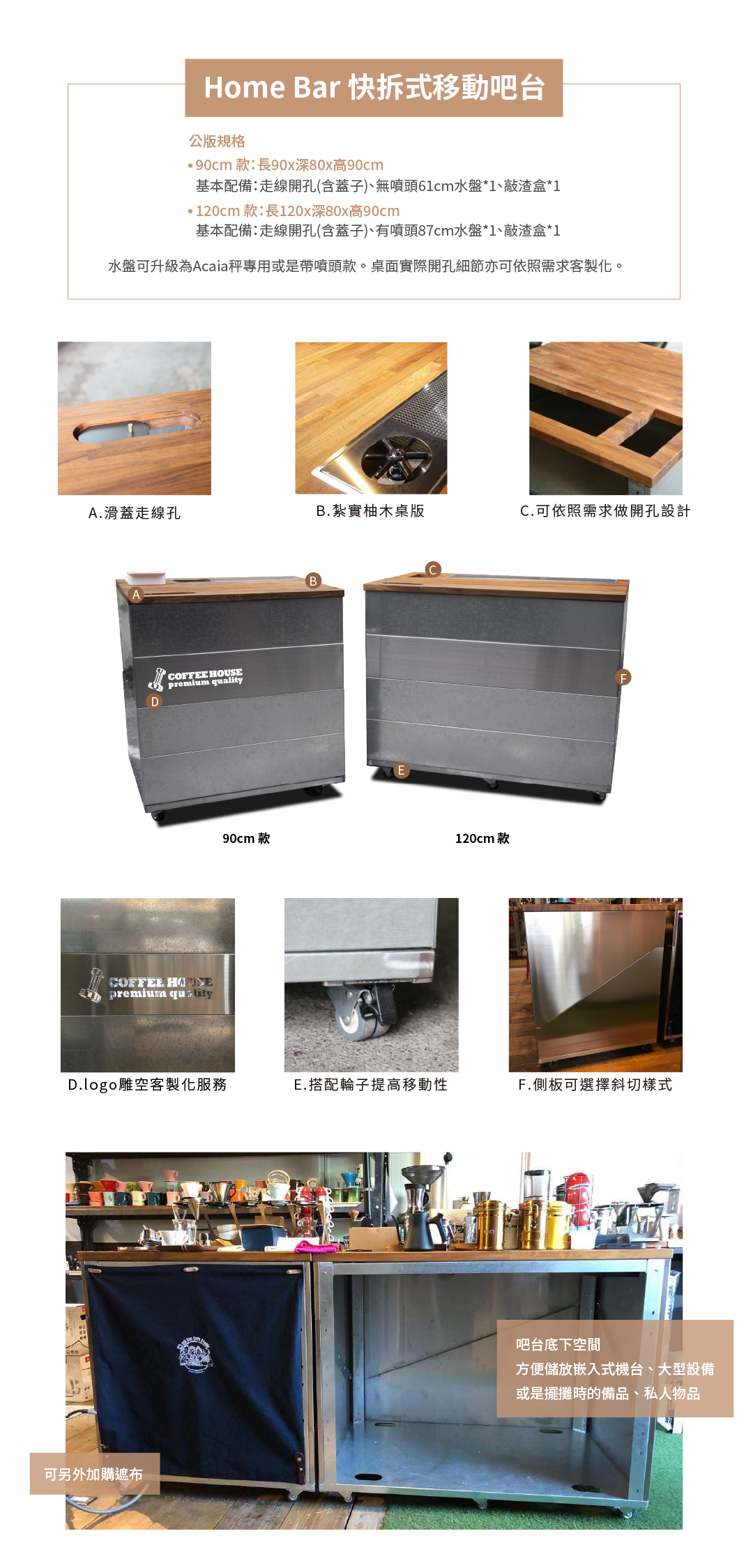 方便輕巧的快拆式移動吧台,快閃店、園遊會或是輕裝潢適用的吧台桌。厚實柚木桌板耐用載重高,下方儲物空間大,可收納多器具、設備以及備品。