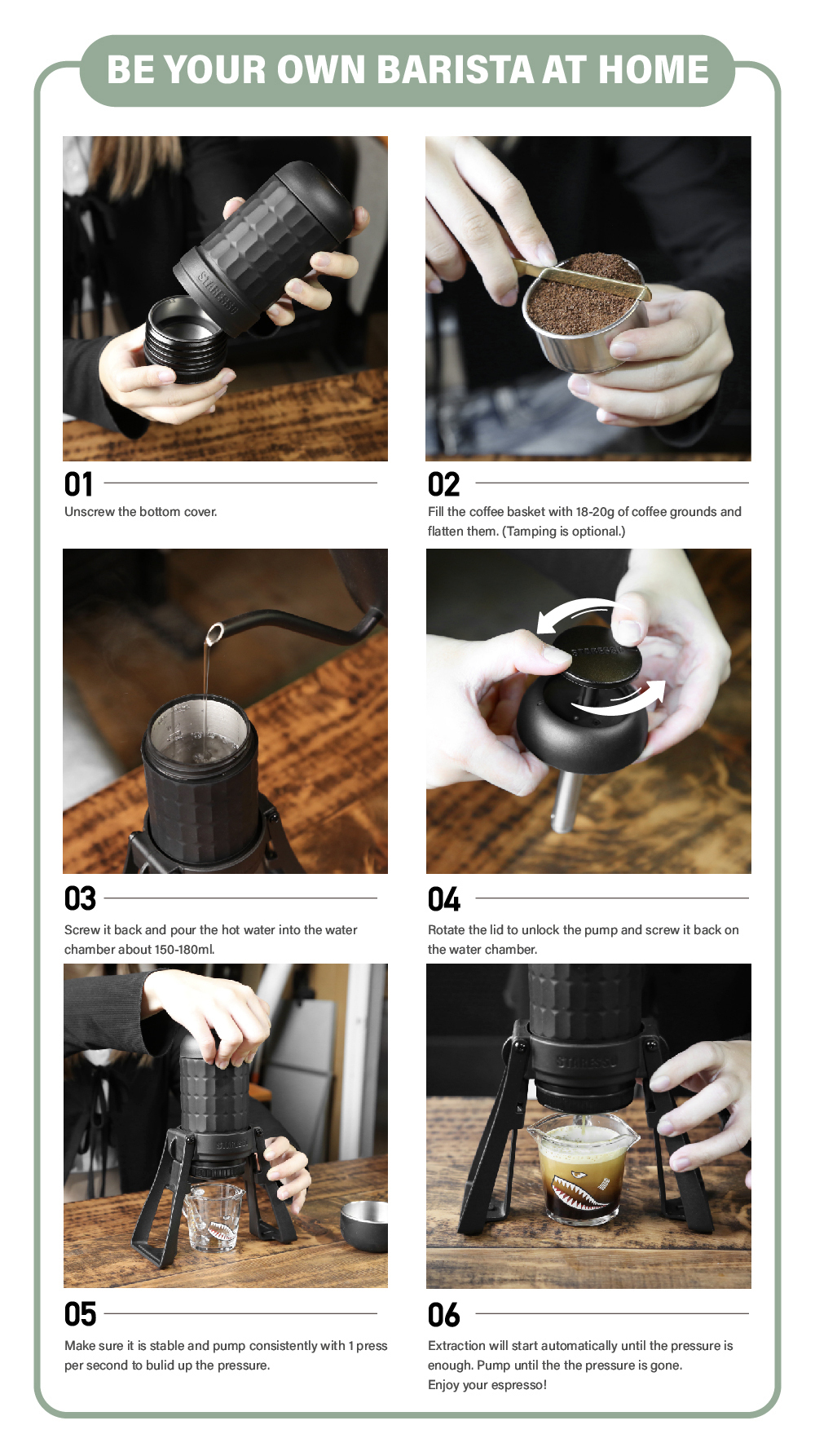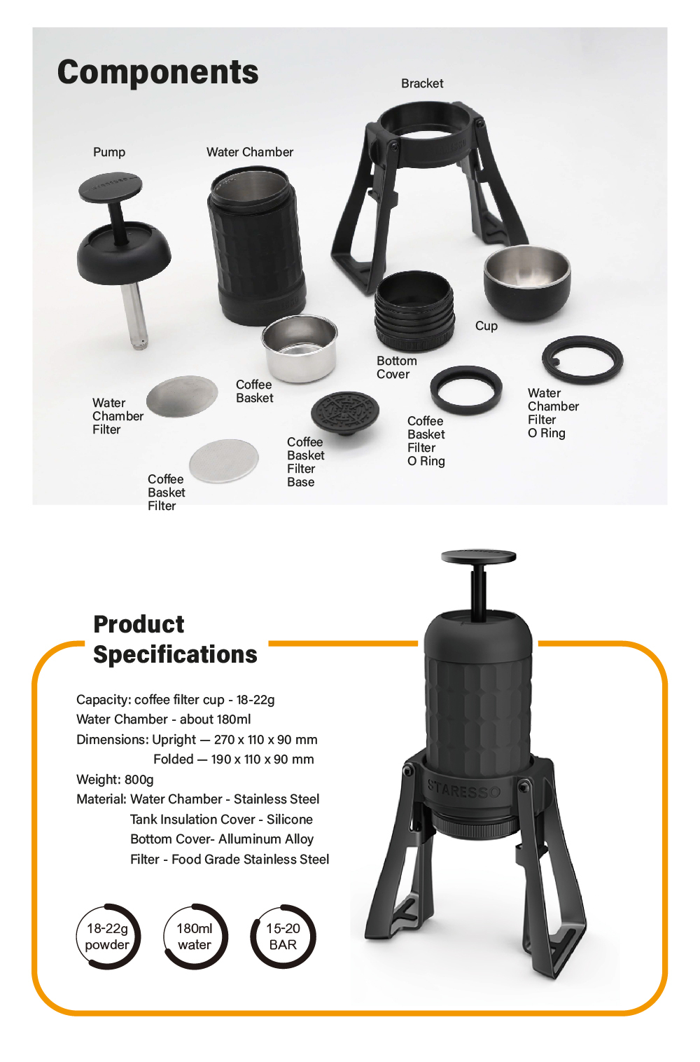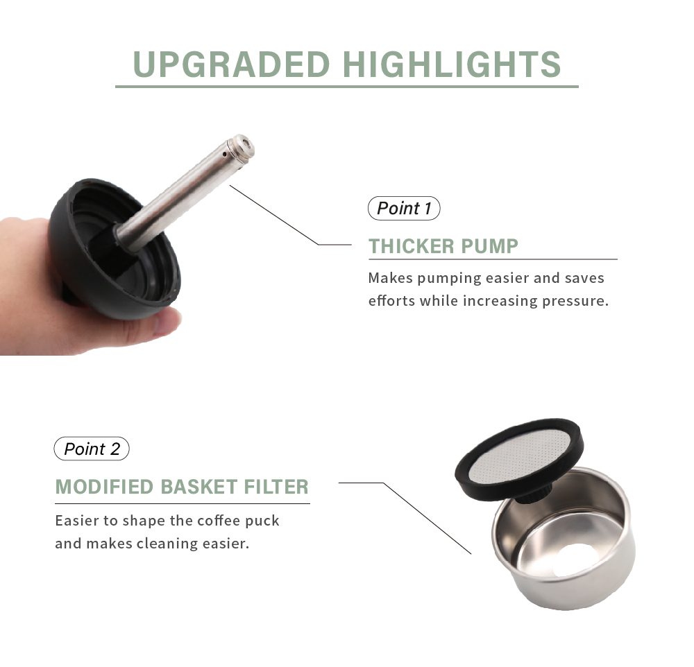 1. Redesigned bottom cover makes coffee puck form easier.