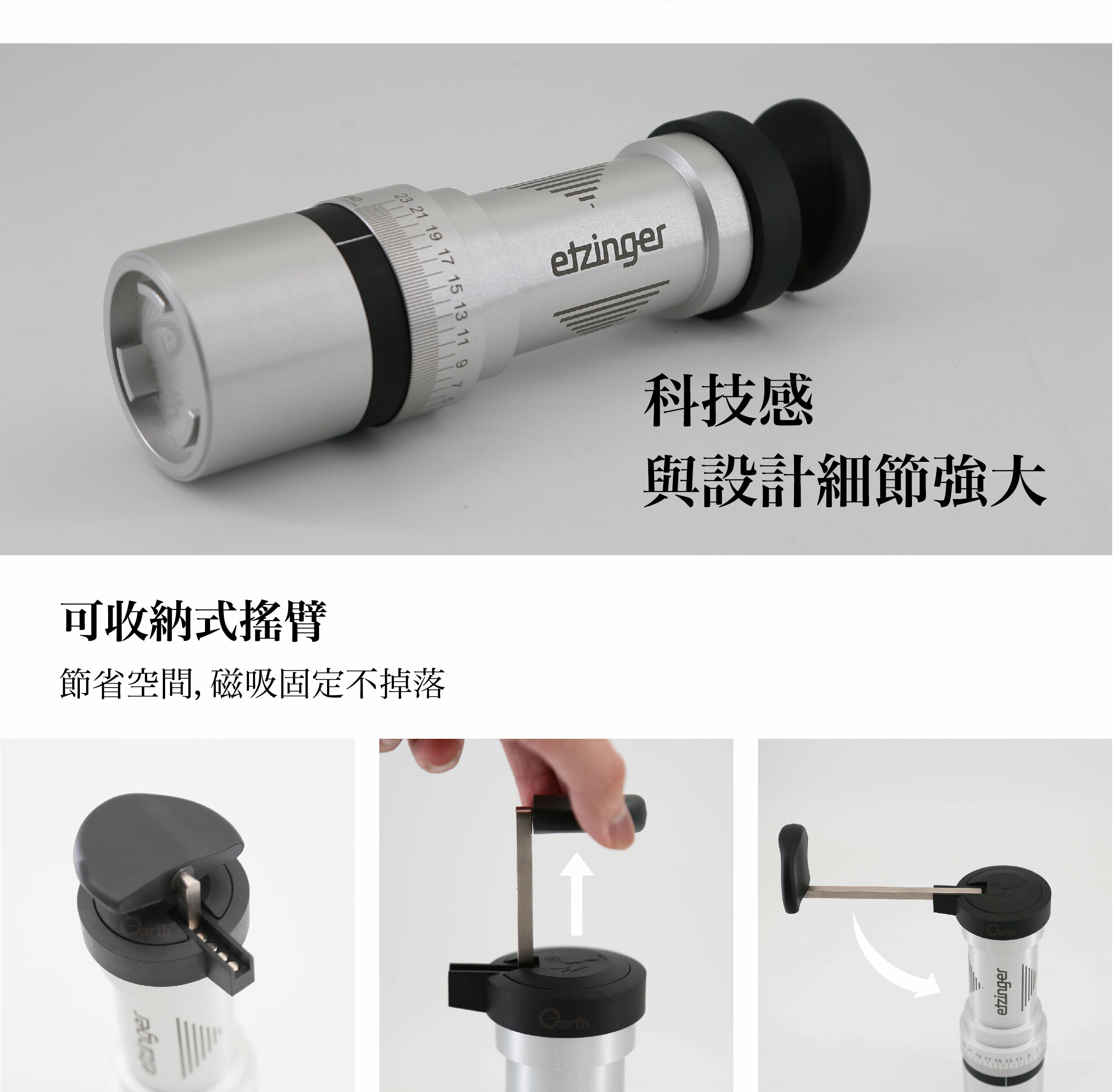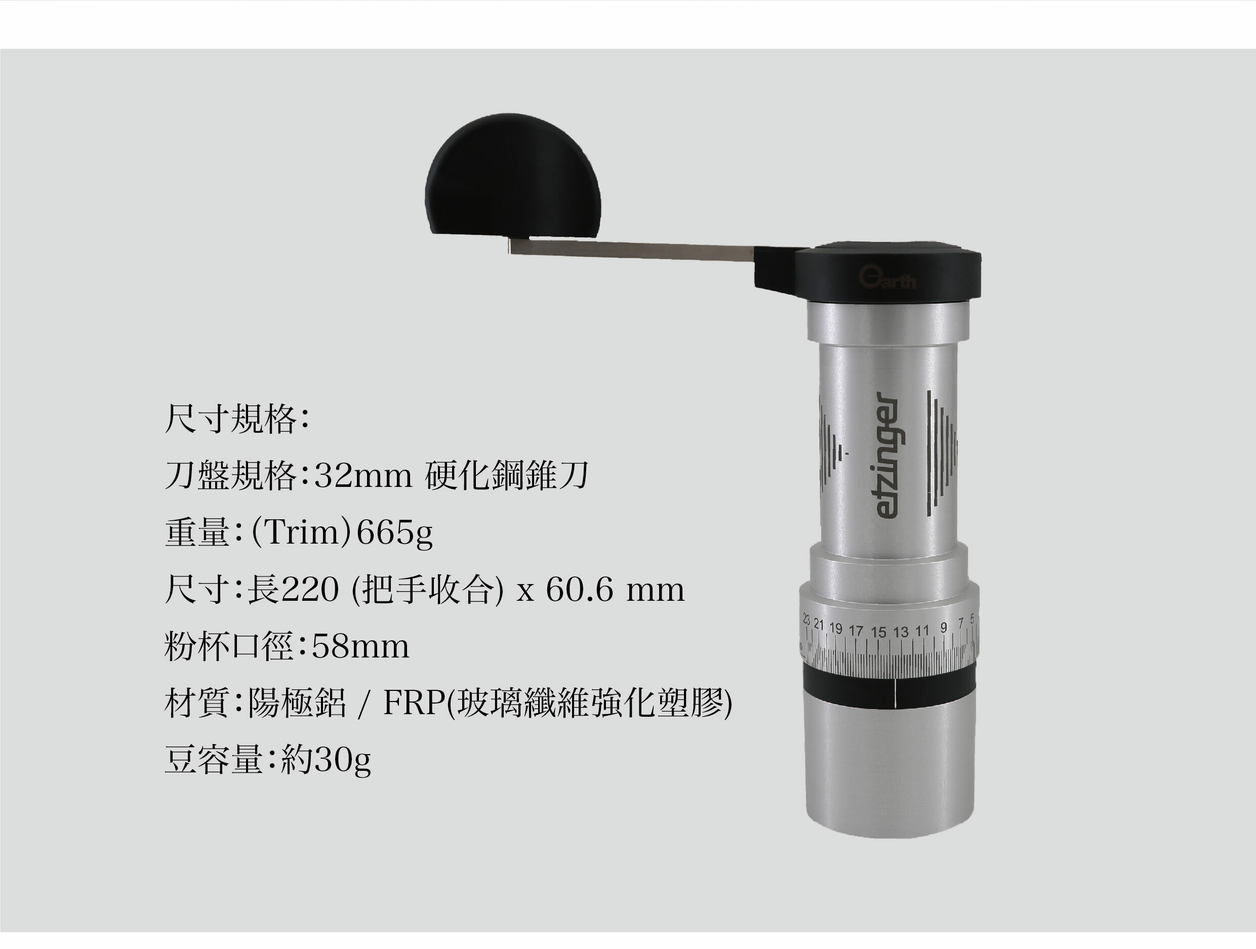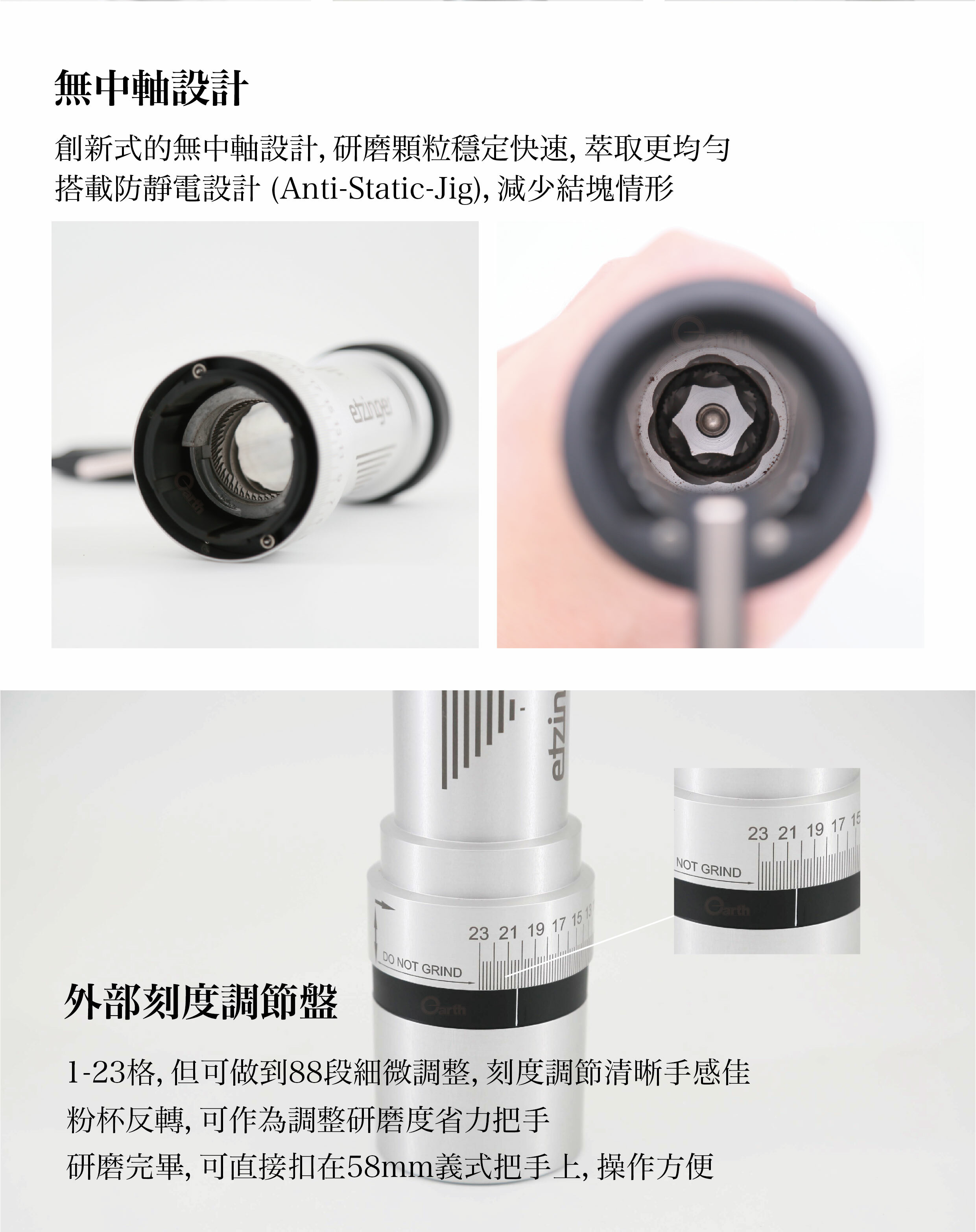 無中軸設計 / RRB-機構,轉外刀環設計 / Anti-Static-Jig 獨家防止咖啡粉靜電結塊技術